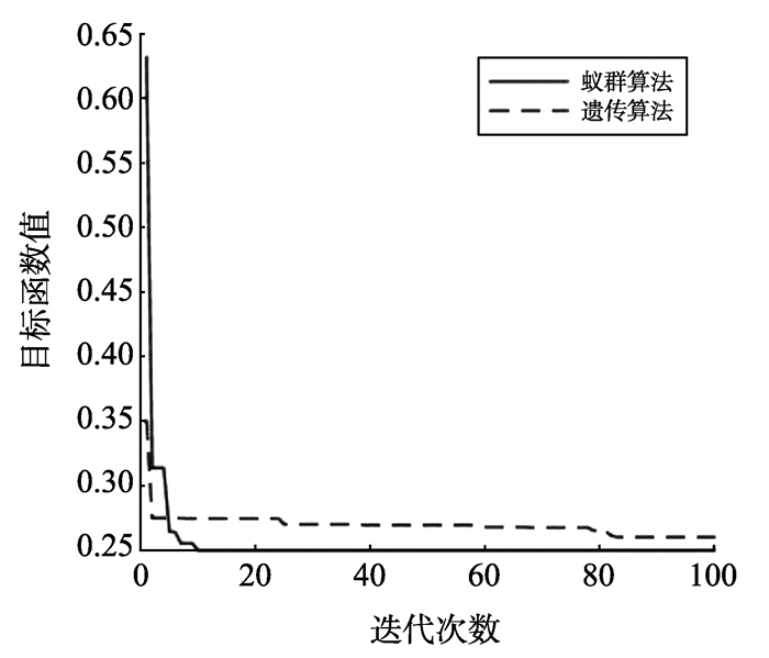 图 1 使用蚁群算法和遗传算法求解目标函数最小值 Figure 1 The minimum value of the objective function by antcolony algorithm and genetic algorithm |